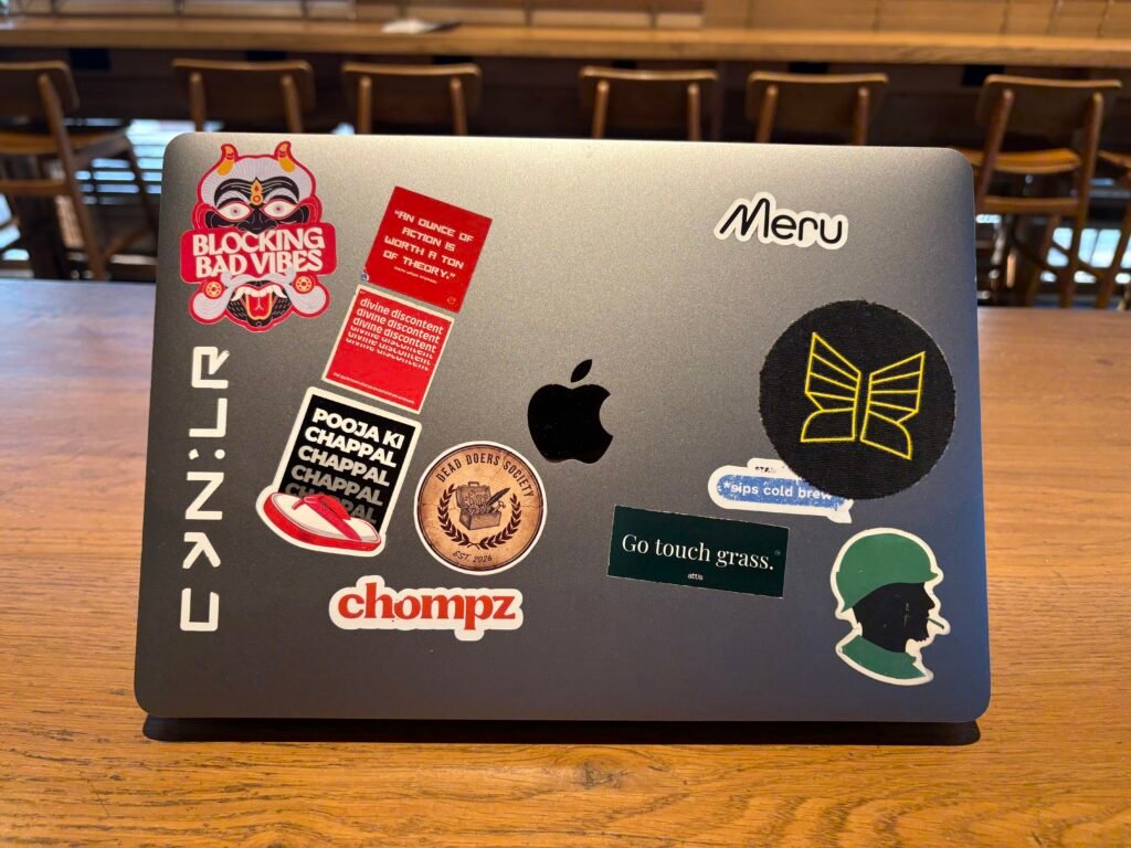 For the longest time, I was the kinds to not put any stickers on my laptop. But then I put Pooja Ki Chappal on the laptop. And then I put CynLr’s. And then once I had two, I let the floodgates open. And today I have all these.